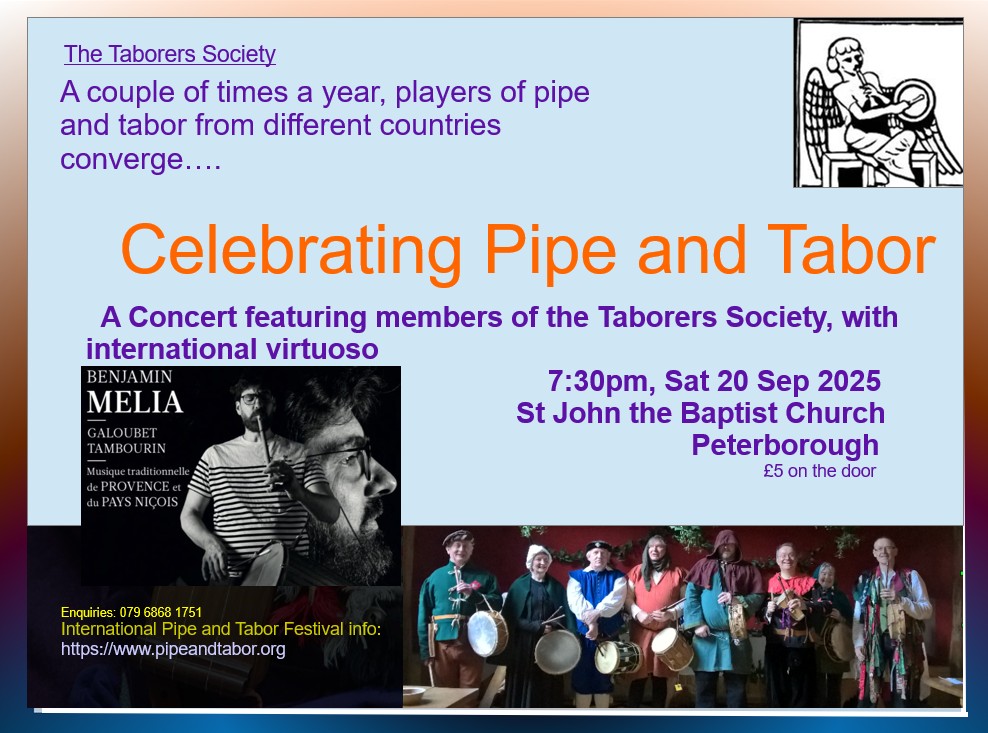 Have fun with us in historic Peterborough 19th to 21st Sep 2025 at the International Pipe and Tabor Festival with French guest artist Benjamin Melia.